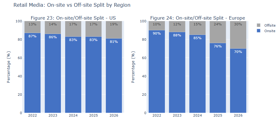 According to estimates from IAB, BCG (ref) and E-marketer, the on-site/off-site split currently lies at 10%/90% but is set to shift to 30%/70% over the next four years, partly driven by the loss of digital identifiers, like third-party cookies, across the open web. There is only so much ad inventory that retailers can offer on their own websites, and off-site provides access to a much wider audience.